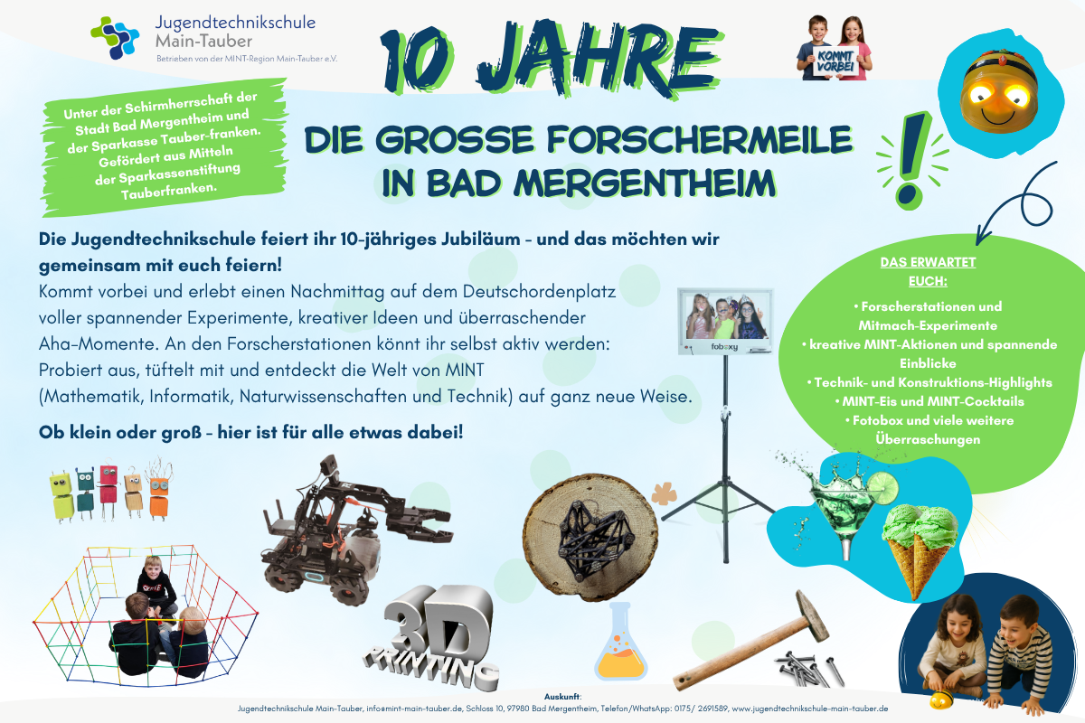 Die Jugendtechnikschule Main-Tauber eröffnet Kinder und Jugendlichen spannende Möglichkeiten, MINT-Themen (Mathematik, Informatik, Naturwissenschaften und Technik) zu entdecken. Kurse und Workshops finden in den Räumlichkeiten in Bad Mergentheim sowie an verschiedenen Orten im Main-Tauber-Kreis statt – Neugierde weckend – forschend – erkenntnisreich.